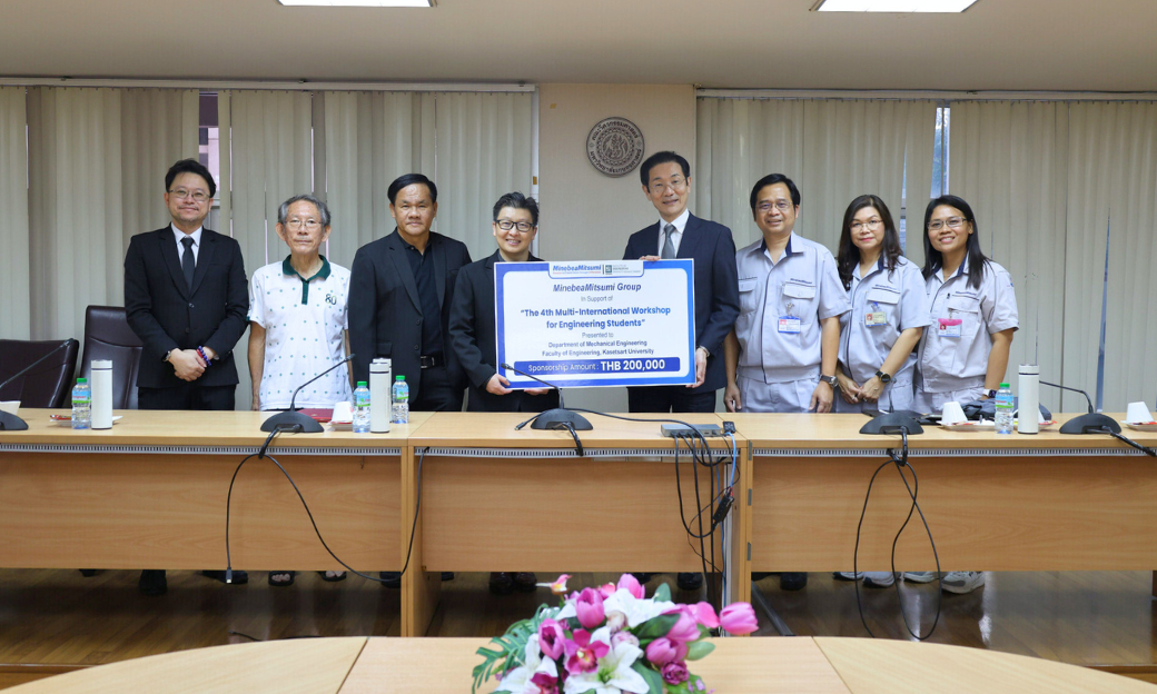 เมื่อวันที่ 21 มกราคม 2569 Mr. Tetsu Shiozaki, Executive Officer, Deputy Head of Sustainability Management Division, กลุ่มบริษัท มินีแบมิตซูมิ (ประเทศญี่ปุ่น) พร้อมด้วยผู้บริหารระดับสูงของกลุ่มบริษัท มินีแบมิตซูมิ (ประเทศไทย) ได้มอบเงินสนับสนุนจำนวน 200,000 บาท เพื่อสนับสนุนการจัดกิจกรรม “The 4th Multinational Workshop for Engineering Students in Thailand 2026” ให้แก่ภาควิชาวิศวกรรมเครื่องกล คณะวิศวกรรมศาสตร์ มหาวิทยาลัยเกษตรศาสตร์ โดยมี ศาสตราจารย์ ดร.วันชัย ยอดสุดใจ คณบดีคณะวิศวกรรมศาสตร์ มหาวิทยาลัยเกษตรศาสตร์ เป็นผู้รับมอบ