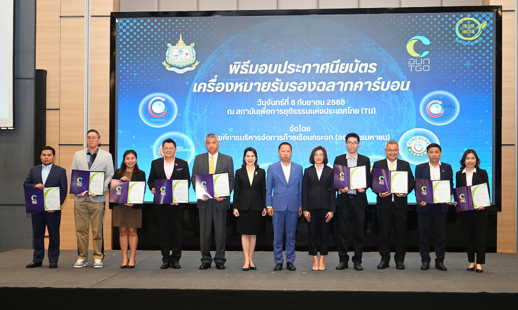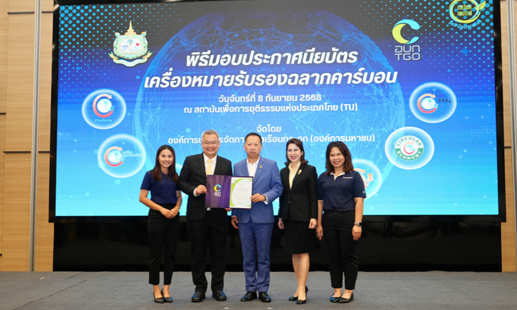 เมื่อวันที่ 8 กันยายน 2568 องค์การบริหารจัดการก๊าซเรือนกระจก (องค์การมหาชน) ได้จัดพิธีมอบประกาศนียบัตรเครื่องหมายรับรองฉลากคาร์บอน ณ สถาบันเพื่อการยุติธรรมแห่งประเทศไทย (TIJ) โดย นายณกรณ์ ตรรกวิรพัท ผู้อำนวยการองค์การบริหารจัดการก๊าซเรือนกระจก (องค์การมหาชน) ได้มอบใบประกาศนียบัตรแก่องค์กรที่ได้รับเครื่องหมายรับรองฉลากคาร์บอน ซึ่งมี นายชัยวัฒน์ ชัยวรรณจินดา ผู้จัดการฝ่ายการจัดการความยั่งยืนและการบริหารความเสี่ยง เป็นตัวแทนรับมอบ