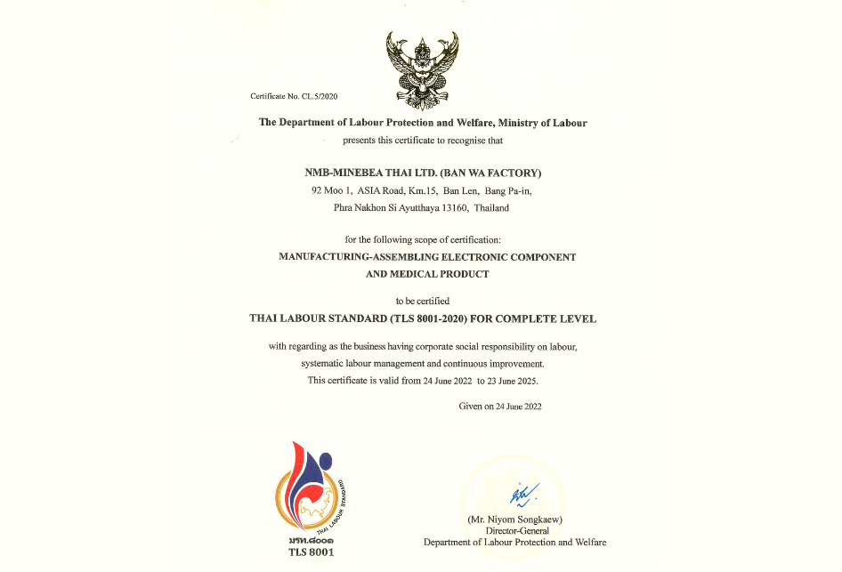 Since 2003, NMB-Minebea Thai Ltd. has been continually certified to Thai Labor Standard (TLS.8001) by the Department of Labor Protection and Welfare, Ministry of Labor. In compiance with the standard, NMB-Minebea Thai Ltd. is committed to provide its employees with good quality of life and treate them in consistent with labor human rights.